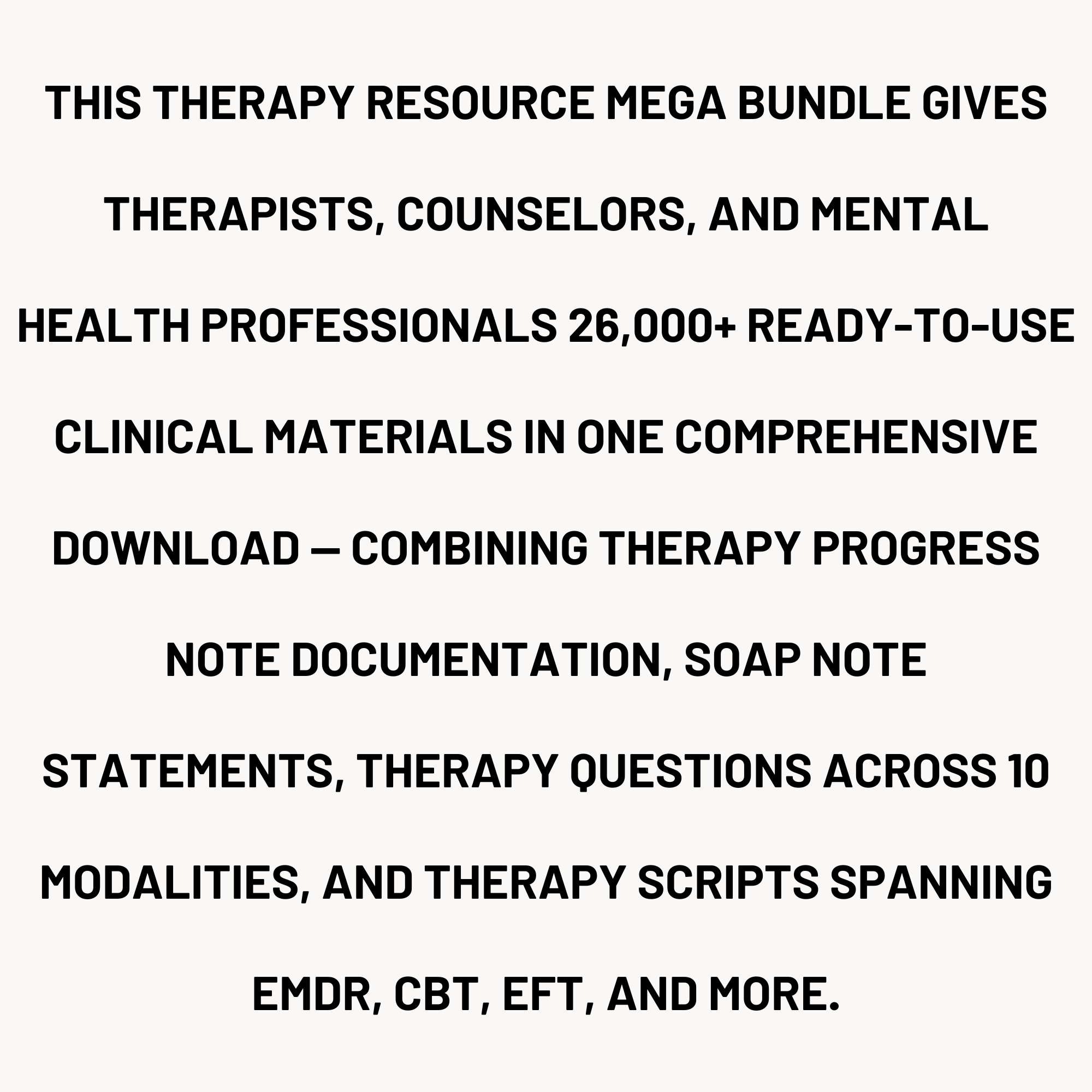 This therapy resource bundle gives therapists, counselors, and mental health professionals 26,000+ ready-to-use clinical materials in one comprehensive download — combining therapy progress note documentation, SOAP note statements, therapy questions across 10 modalities, and therapy scripts spanning EMDR, CBT, EFT, and more.