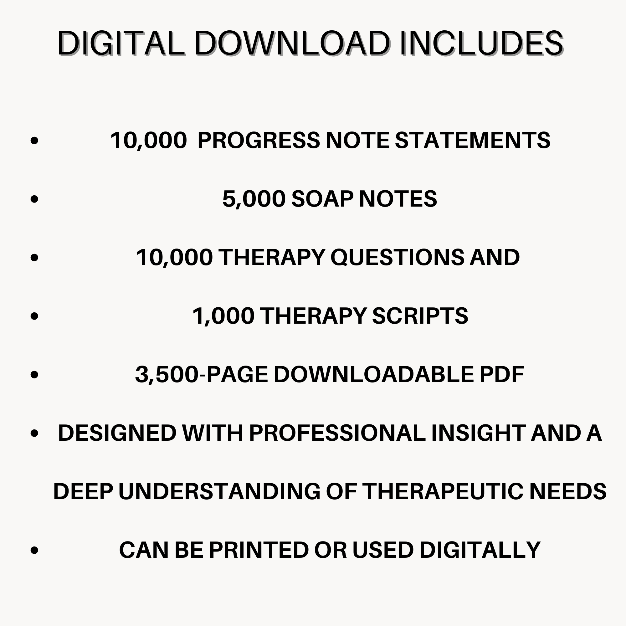 This bundle gives therapists, counselors, and mental health professionals 26,000+ ready-to-use clinical resources — including 10,000 progress note statements, 5,000 SOAP note phrases, 10,000 therapy questions across 10 modalities, and 1,000 therapy scripts — all in one comprehensive instant digital download.